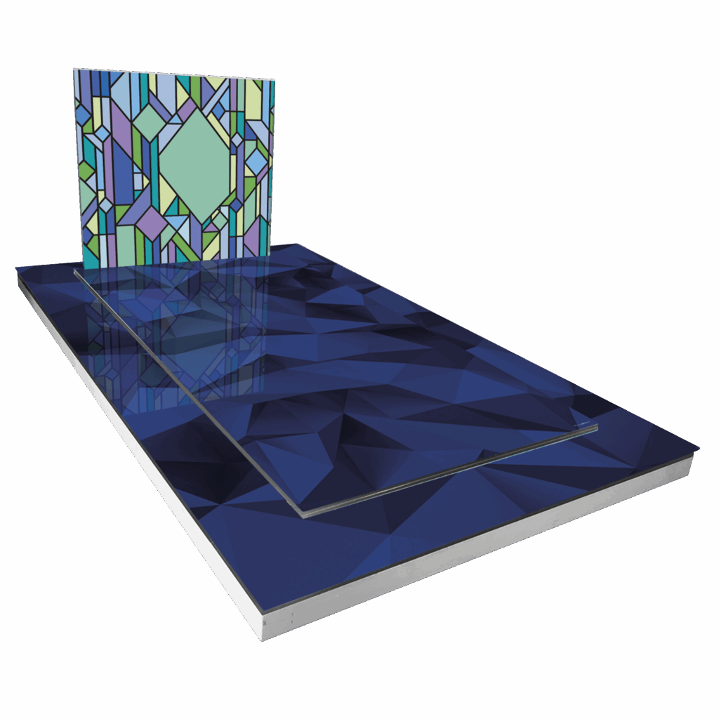 Envol Bleu : Monument funéraire illustrant des motifs aériens en nuances de bleu, évoquant le ciel et le vol libre.