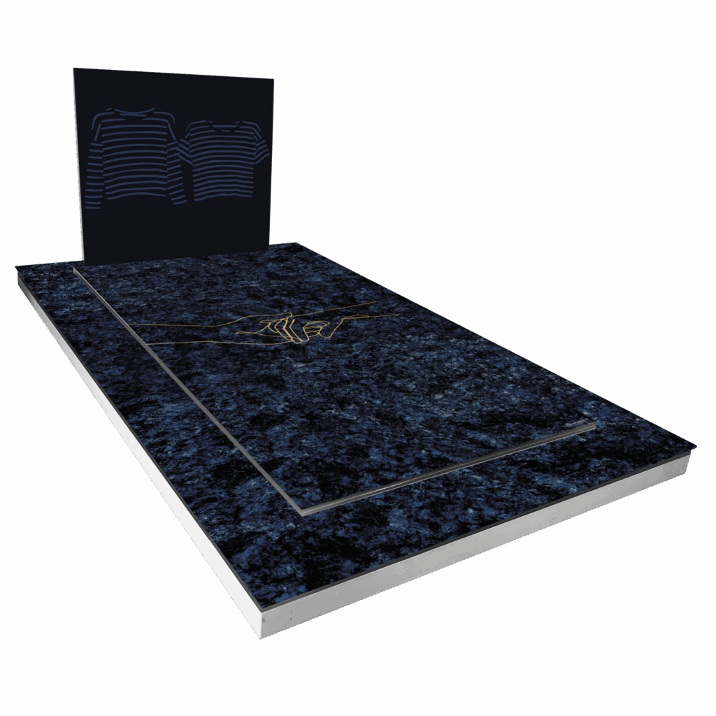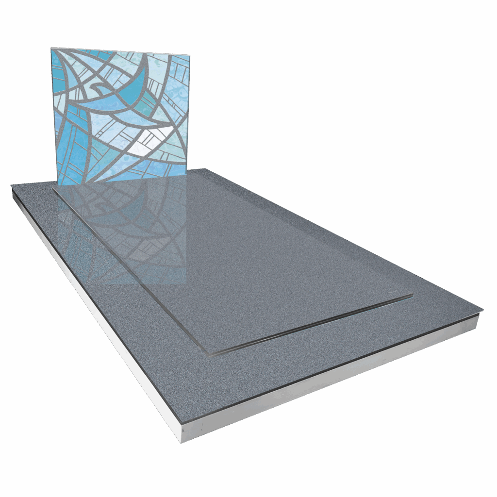 La stèle Envol Bleu met en avant des motifs interconnectés, rappelant des ailes, dans des nuances de bleu et de gris, symbolisant le rêve, le voyage et l'immensité du ciel.