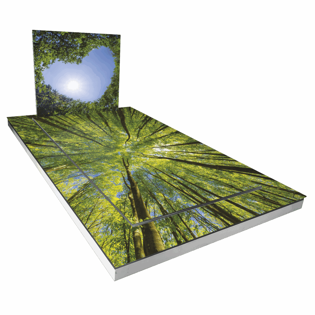 Monument majestueux illustrant une forêt dense, avec une perspective de canopée s'élevant vers le ciel.