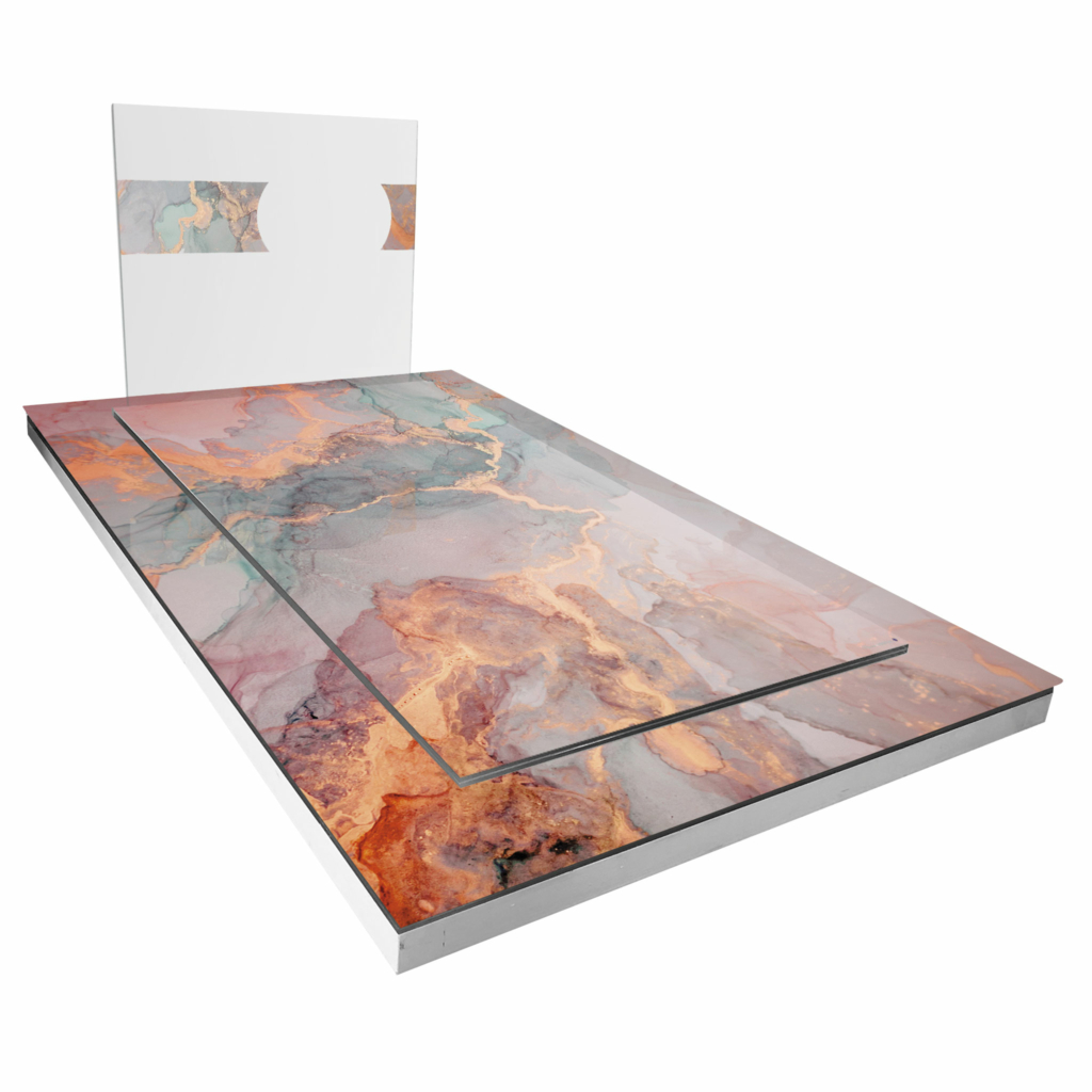 La stèle Envol Vert présente un mélange harmonieux de teintes verdâtres, avec des motifs ressemblant à des ailes ou des feuilles, symbolisant la liberté, la croissance et la nature.