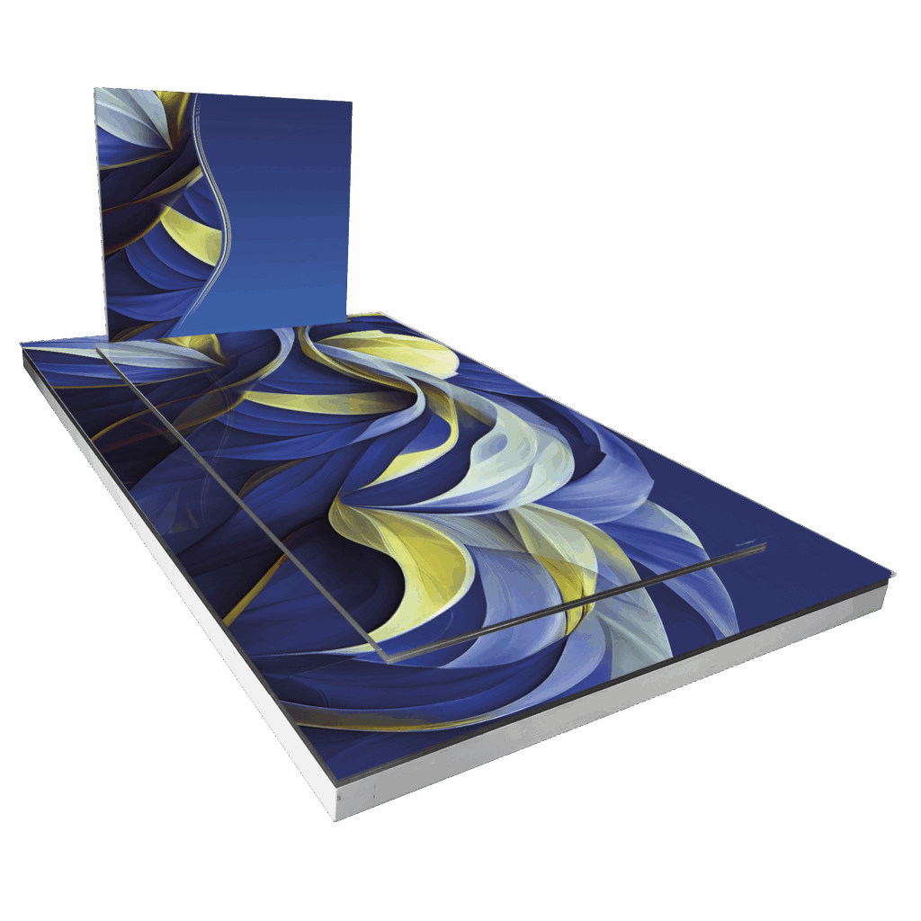 Monument funéraire Musique Blues, un hommage vibrant mêlant formes fluides et nuances de bleu et jaune, évoquant l’énergie, le rythme et l’émotion profonde de la musique blues.