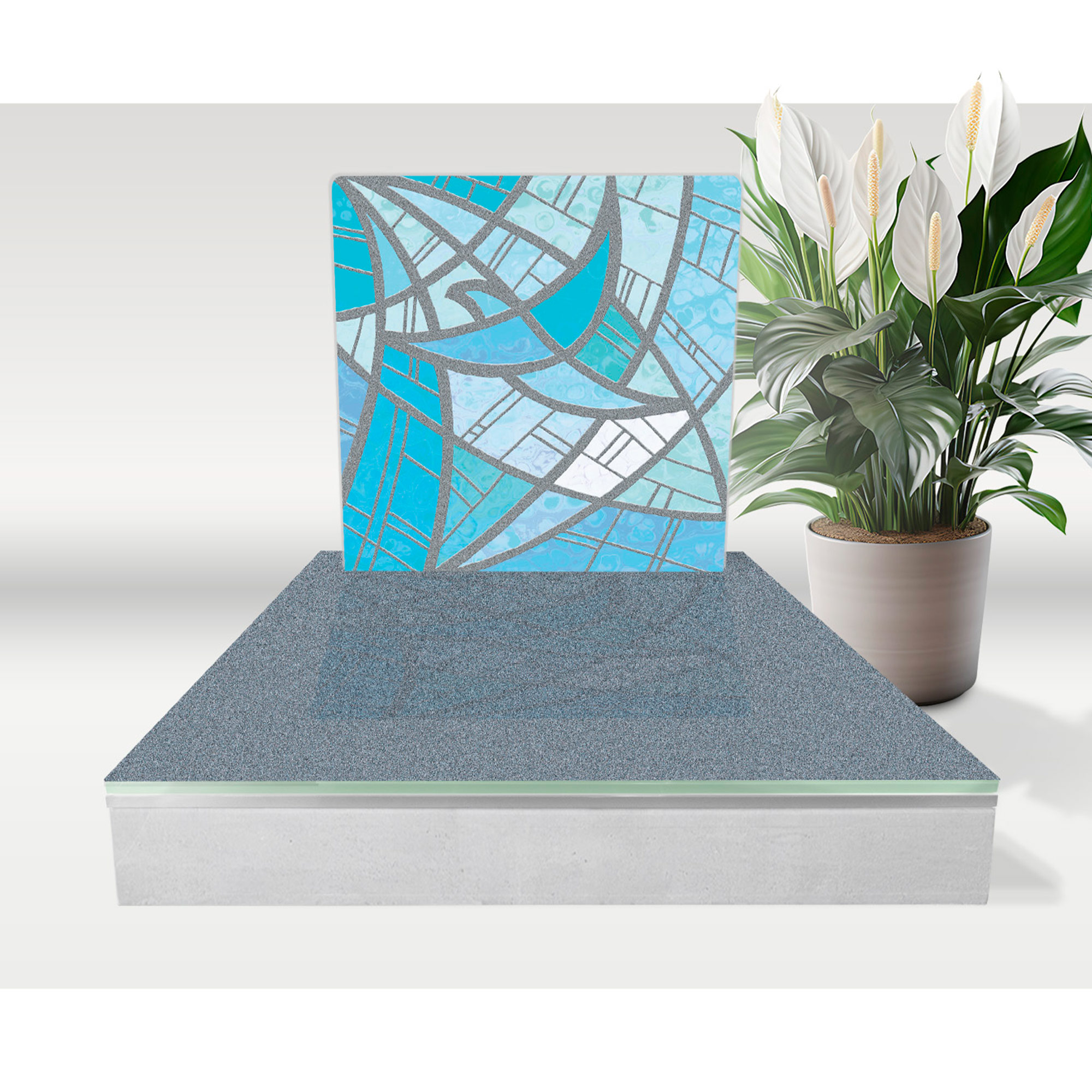 Le cinéraire Envol est un symbole de liberté et d'ascension, caractérisé par ses motifs angulaires en bleu rappelant un oiseau en plein vol dans un ciel serein.