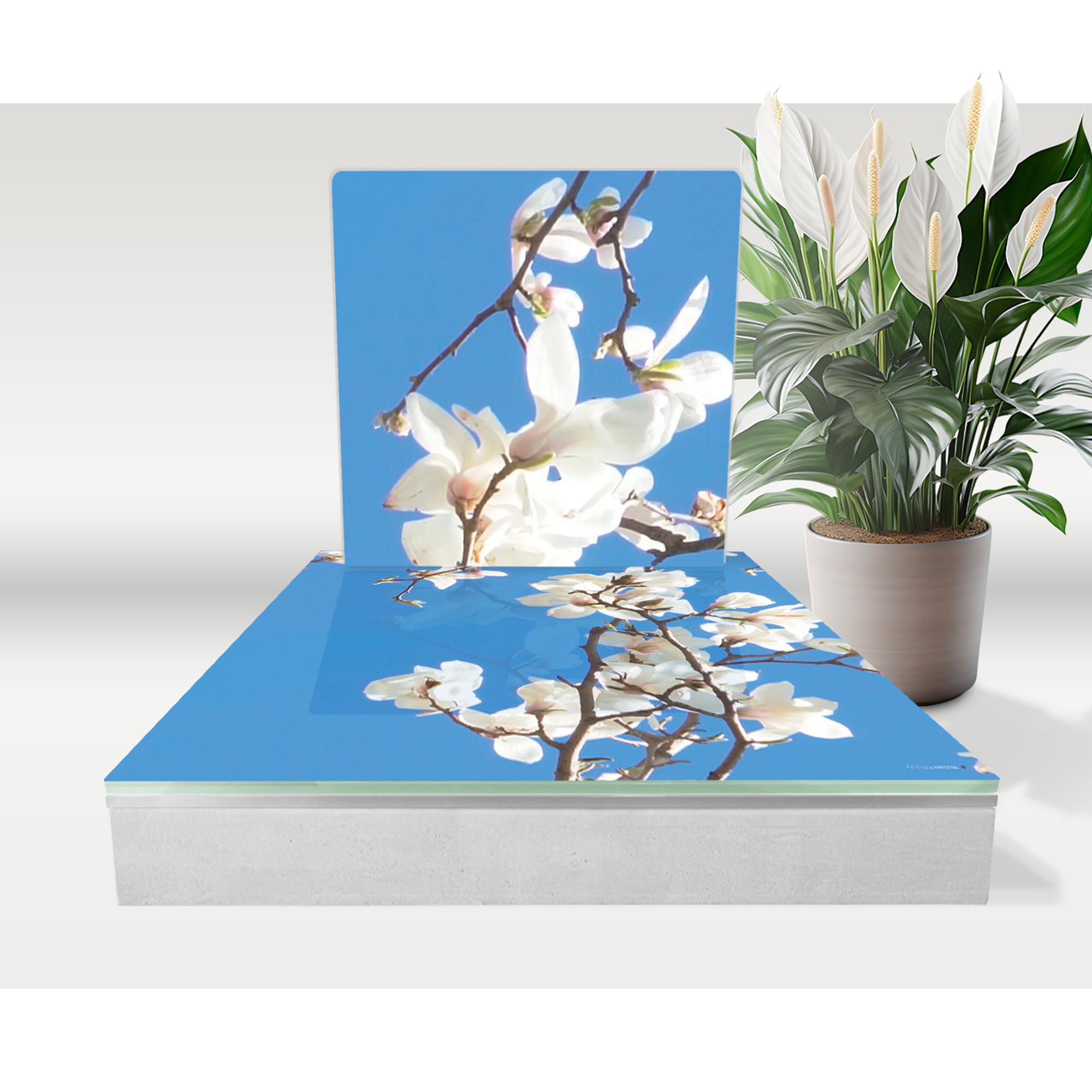 Ce design capture la beauté sublime du magnolia en pleine floraison. Les fleurs blanches éclatantes se détachent harmonieusement sur un fond bleu, rappelant un ciel printanier. Chaque pétale est détaillé avec soin, reflétant la nature délicate et éphémère de cette fleur emblématique. Le magnolia, souvent associé à la noblesse et à la dignité, offre ici une évasion vers un moment paisible et contemplatif.