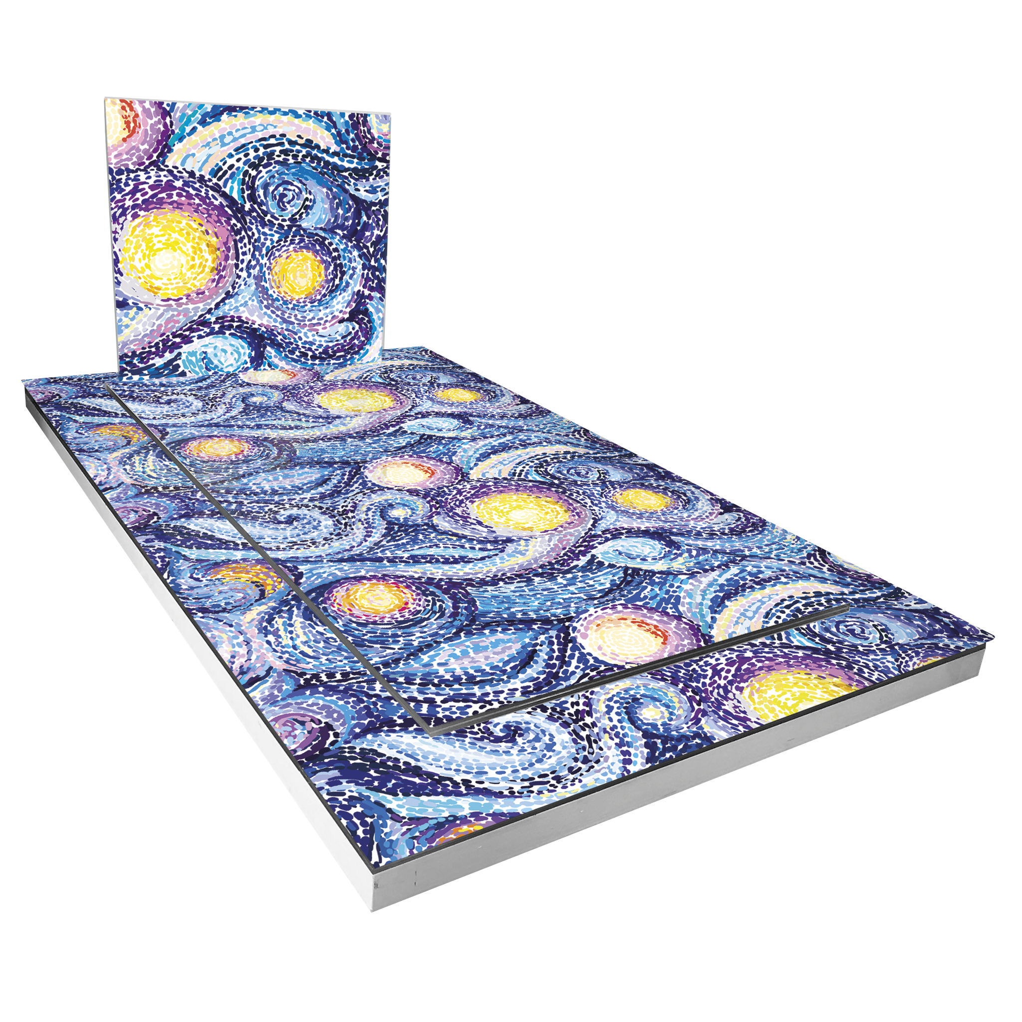 Monument vibrant dépeignant un motif cosmique d'astres, avec une dominante de teintes bleues parsemées de points lumineux évoquant des étoiles.