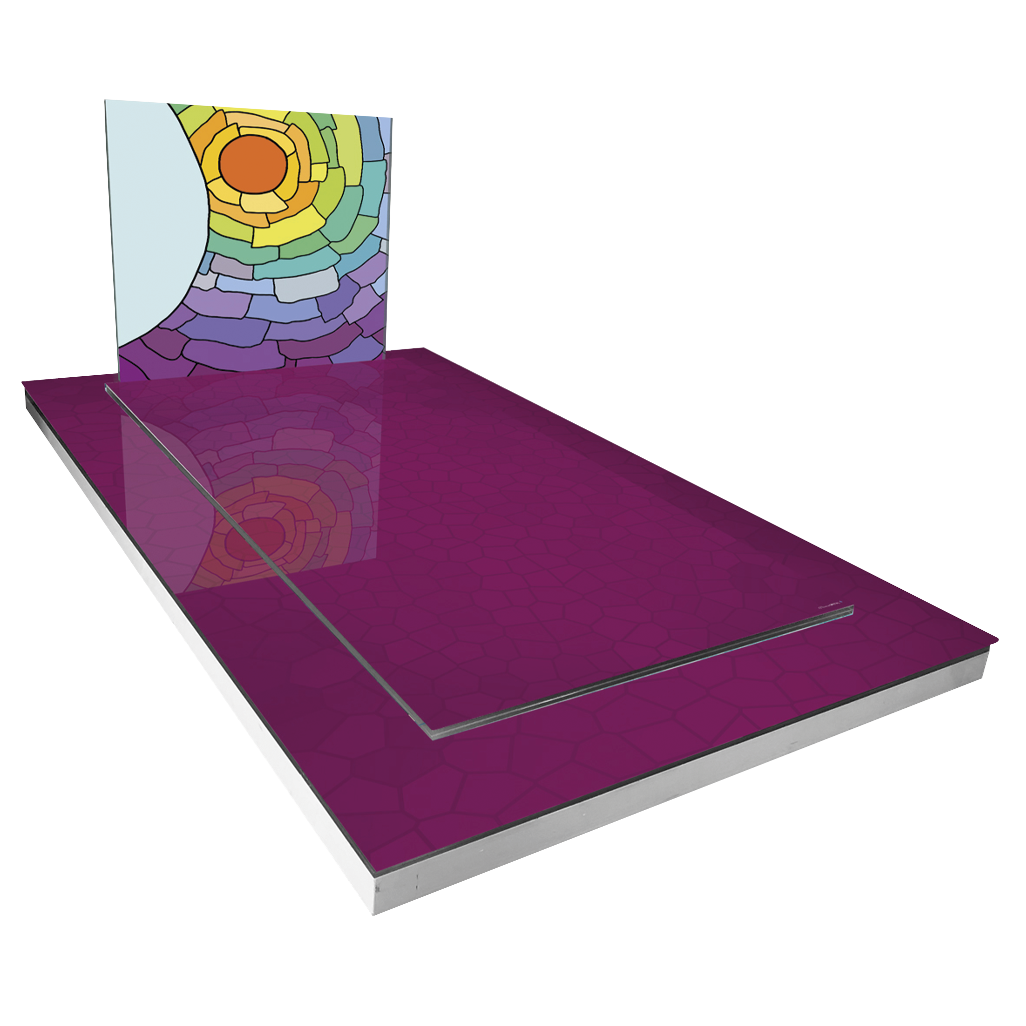 Le monument Aurore Violine capture la beauté paisible de l’aurore avec des nuances profondes de violet et de pourpre. La dalle violet intense sert de base à un motif solaire aux couleurs variées, rappelant l’éclat d’un lever de soleil. Les détails soignés et la combinaison harmonieuse des couleurs font de ce monument un symbole de paix, de tranquillité et de mémoire. L’ensemble évoque le sentiment de sérénité qui accompagne l’aube et rappelle le cycle éternel de la vie et de la renaissance.